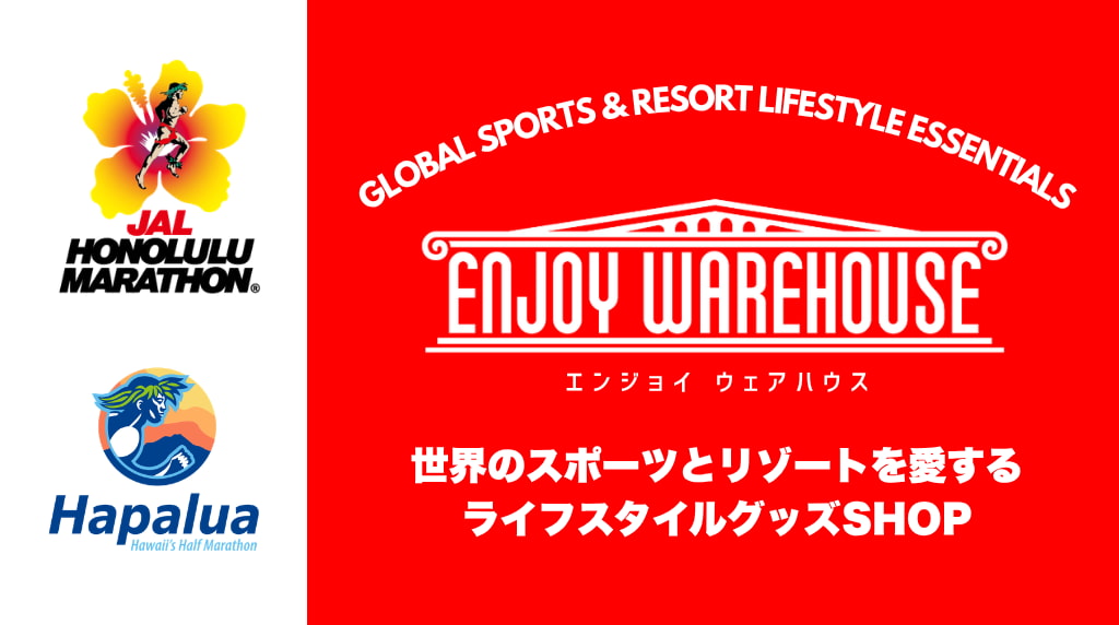 ENJOY WAREHOUSEでJALホノルルマラソン、ハワイズハーフマラソンハパルアのグッズを発売中!