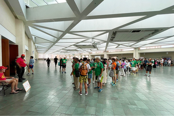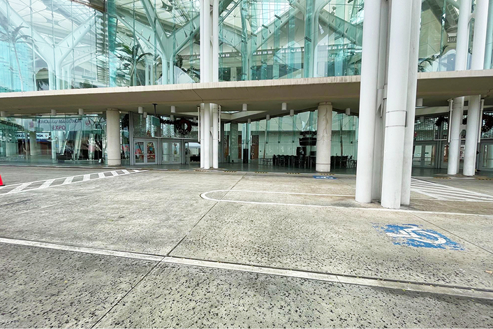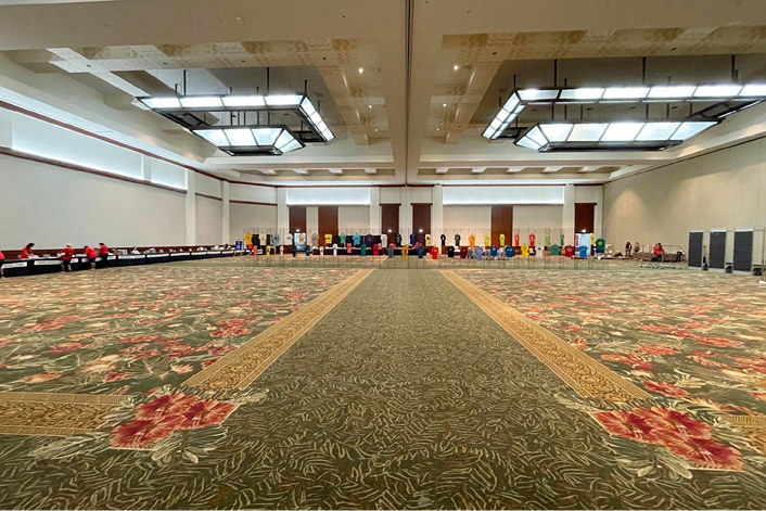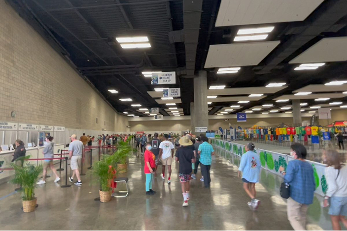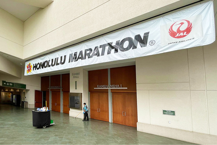 会場のハワイ・コンベンション・センターの正面エントランス、1Fゼッケン引換会場はバリアフリー。