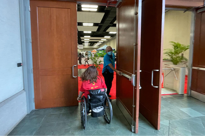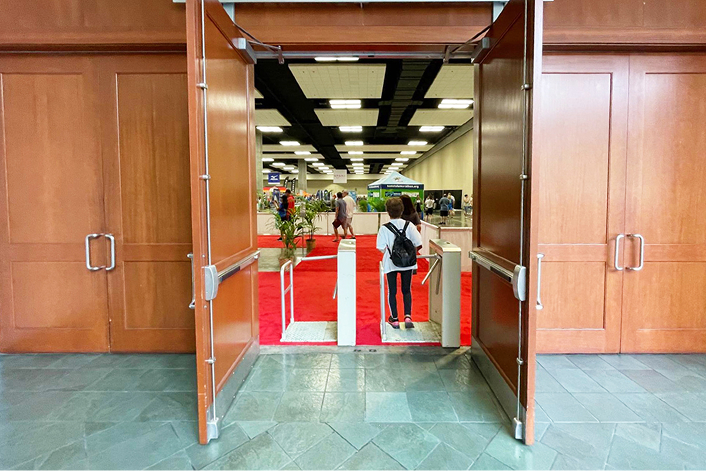 EXPO会場入口は入場者カウントのゲートが設置されているが、車いすユーザーやベビーカーは隣のドアから入場可能。