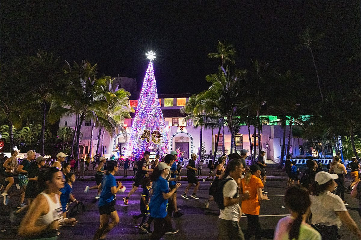 4キロ地点のホノルル市庁舎とイオラニ宮殿には、ライトアップされたサンタクロースファミリーや巨大なクリスマスツリーなど、数々のきらびやかなイルミネーションが。常夏のクリスマスを写真に収めようと、宮殿の前にはランナーたちの列ができます。
