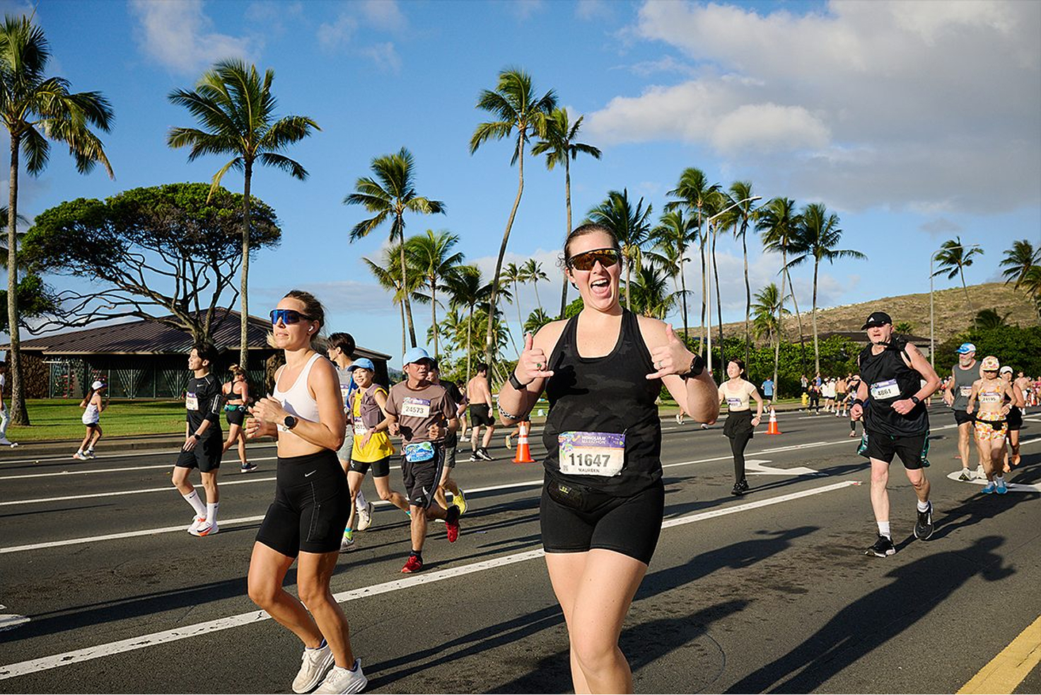 多種多様なランナーが参加するJALホノルルマラソンの大会記録は、2時間07分59秒(2019年大会)。世界のトップアスリートも多数参加しています。 また、タレントや俳優、スポーツ選手などが市民ランナーに混じって走っていたり、沿道で応援していることも。