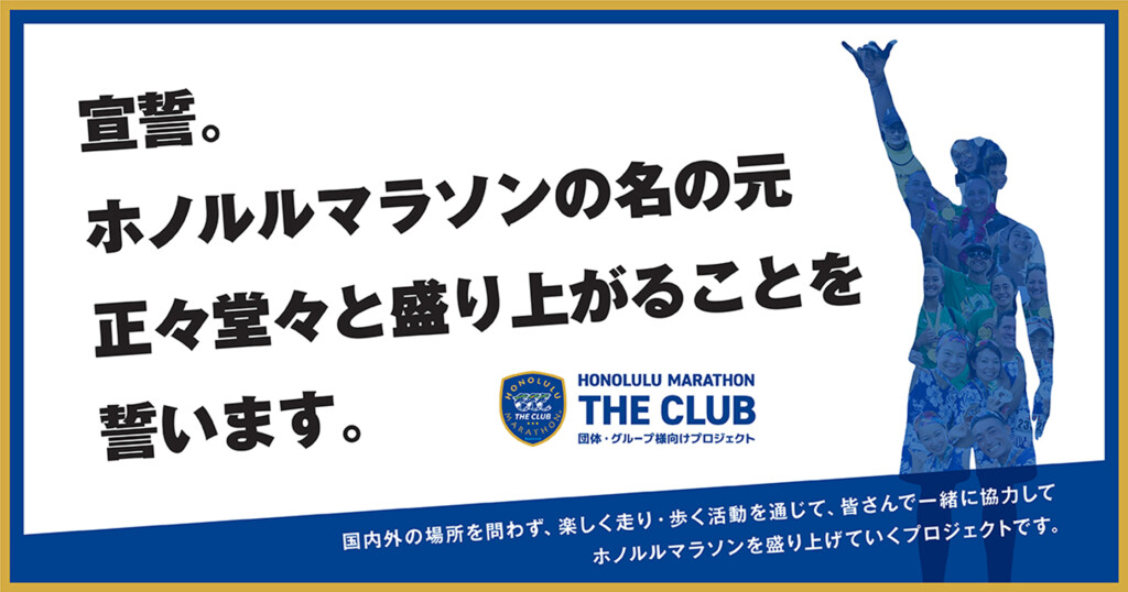 このプロジェクトに参画してくださる団体・グループの皆さまを募集しています。 ホノルルマラソン日本事務局公式サイトにて、登録した団体・グループのサイトURLやSNSを紹介します。 また、「JAL Honolulu Marathon THE CLUB」のネーム(ワード)、ロゴをサイトやSNSなどでご自由に使用いただくことができます。