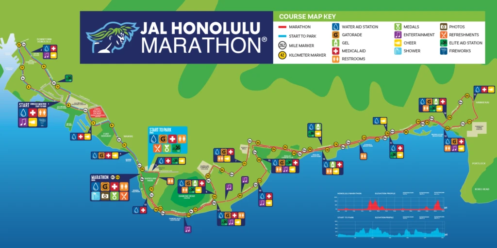 アラモアナ公園をスタートした後、世界的に有名なワイキキビーチ、ダイヤモンドヘッドを経てハワイカイで折返し、カピオラニ公園でフィニッシュするという、壮大なシーサイドコースです。 コースの高低については、ダイヤモンドヘッド付近の短い坂を除けば、ほとんどが平坦で走りやすいコースになっています。 コース上の17箇所(予定)にエイドステーション(給水所)が設置され、すべてのエイドステーションに医療スタッフが待機しています。