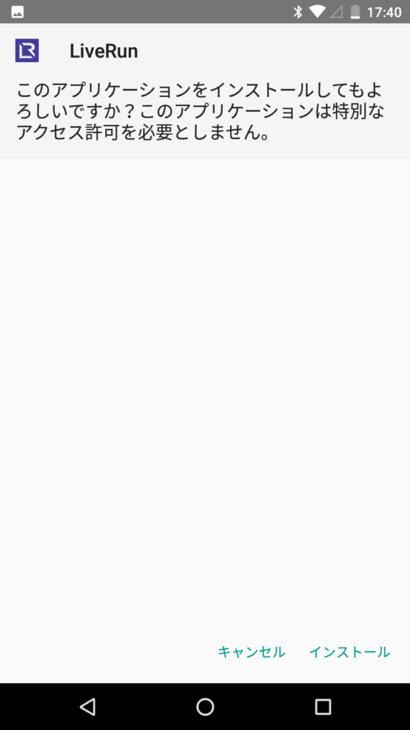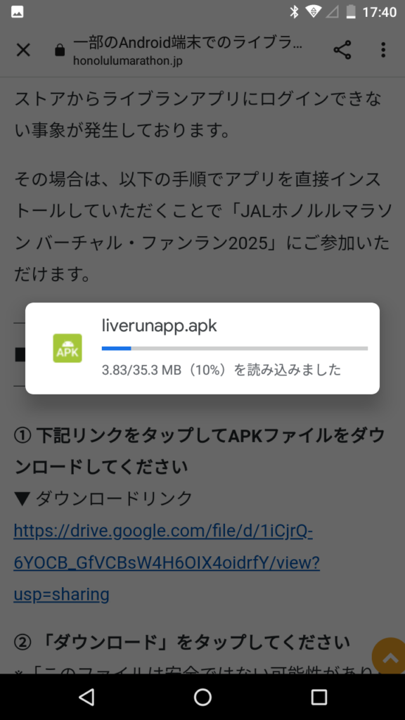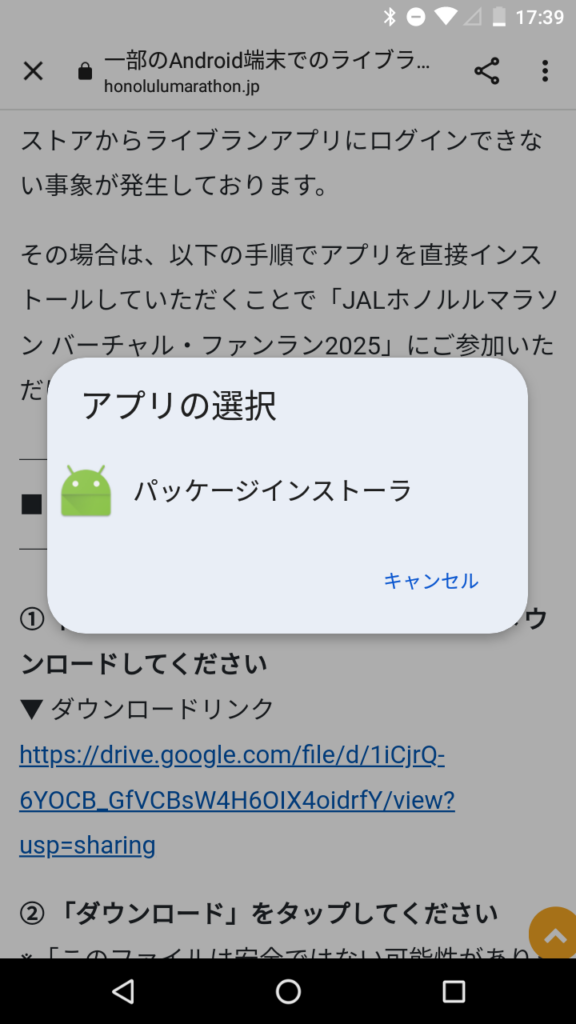 ※ダウンロードしたファイル「liverunapp.apk」はライブラン公式アプリです。
