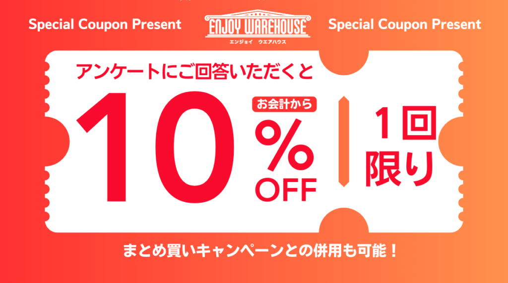こちらのクーポンは、現在実施中のアパレルまとめ買いキャンペーンと併用可能です。まとめ買い割引とあわせて、さらにおトクにお買い物をお楽しみいただけますので、ぜひこの機会にアンケートへご参加ください。