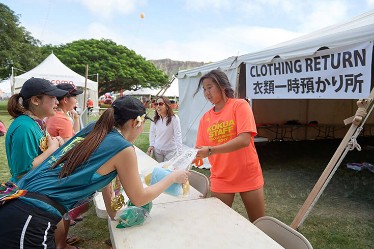 - 大会前日(土曜日)午前10時~午後5時に、カピオラニ公園の衣類預かりテントに公式バッグを預ける。