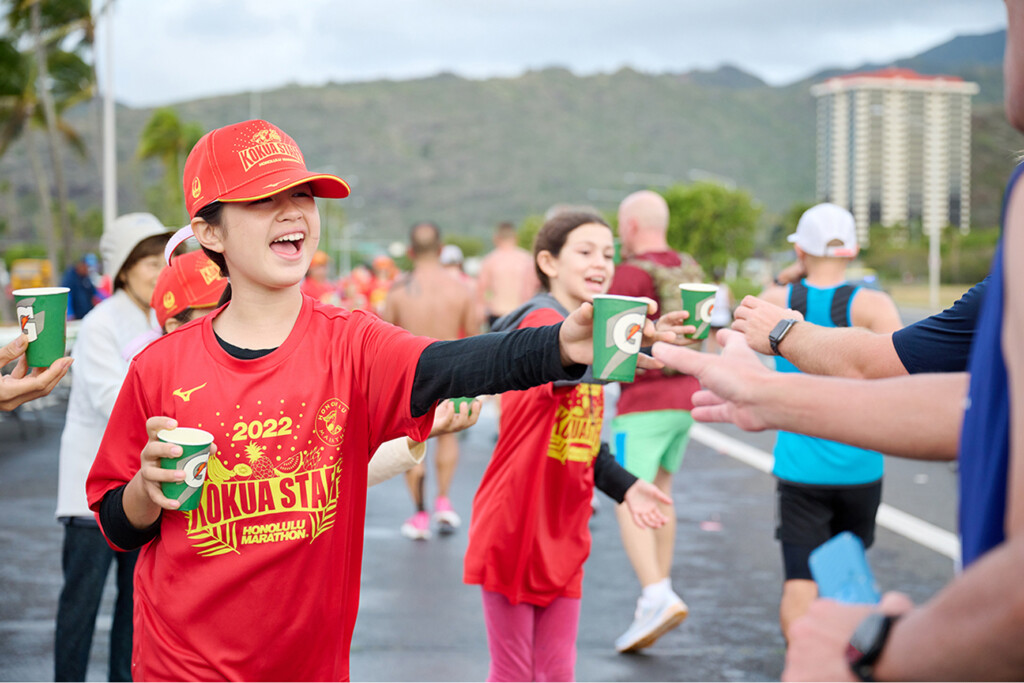 JALホノルルマラソンはどなたでも楽んで挑戦できる大会運営を行っていますが、補給食の豊かさを打ち出しているイベントではありません。 参加者の皆様がそれぞれご自身の体調を管理できるよう必要な準備(補給食や日よけ対策など)を行ってください。